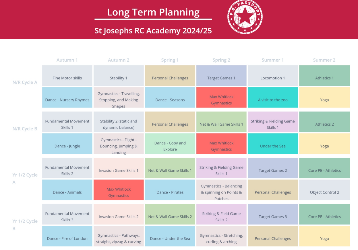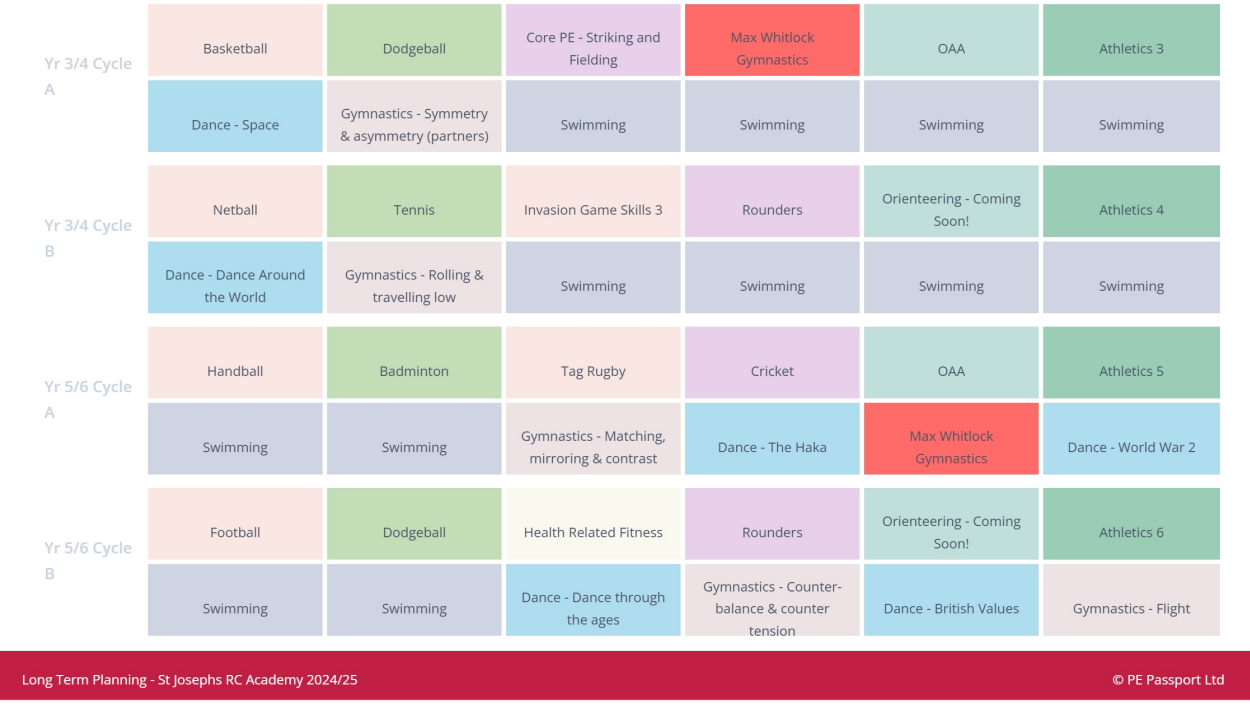 At St Josephs, we follow the PE Passport scheme. The PE Passport is child centred and allows pupils’ achievements in and out of school to be celebrated. Children will experience a range of skills to build towards exploring sports used around the world.